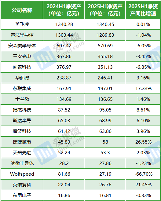 美股市场则呈现“普遍收缩”态势,Wolfspeed净资产同比收缩66.7%,核心原因是净利润大幅亏损与资产减值;安森美半导体(-6.1%)、意法半导体(-1.04%)、纳微半导体(-1.2%)均因盈利下滑或亏损导致净资产小幅收缩;仅英飞凌净资产基本持平(0.01%),但增长动力不足。这一差异表明,A股+港股企业长期成长的资本基础更稳固,持续的产能投入(如芯联集成8英寸SiC产线、捷捷微电车规级封装产线)为未来增长奠定基础,而美股企业面临资本实力弱化的风险,可能影响长期技术研发与市场拓展。
