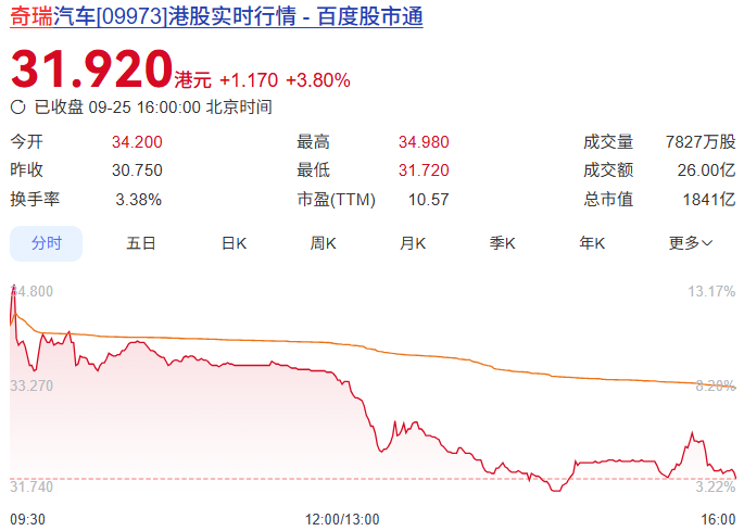 9月25日,奇瑞汽车股份有限公司(股票代码:9973.HK)在香港联合交易所主板正式挂牌上市。此次上市,奇瑞汽车以每股30.75港元的招股价上限定价,全球发售约2.97亿股H股,募集资金总额约91.45亿港元,成为年内港股市场规模最大的车企IPO。截至收盘,奇瑞汽车股价为31.92港元,较发行价上涨3.8%,总市值为1841亿港元。