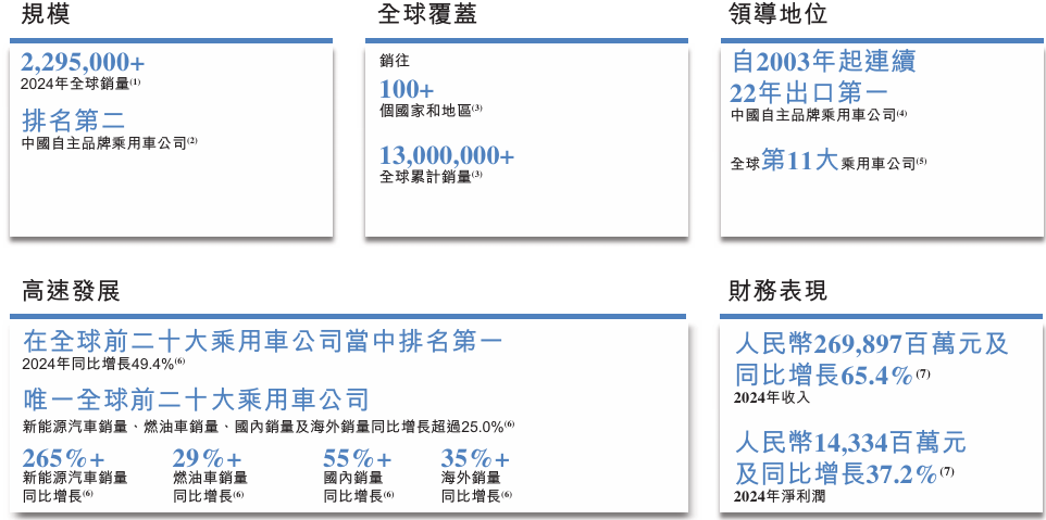 奇瑞汽车股份有限公司是一家位于中国芜湖的乘用车公司,自1997年成立以来,一直致力于引领行业创新和深耕国际市场。公司设计、开发、制造和销售多样化的乘用车产品组合,包括燃油车和新能源汽车,满足国内外市场用户的不同及不断变化的需求和喜好。根据弗若斯特沙利文的资料,以2024年的全球乘用车销量计算,奇瑞汽车是中国第二大自主品牌乘用车公司和全球第十一大乘用车公司。