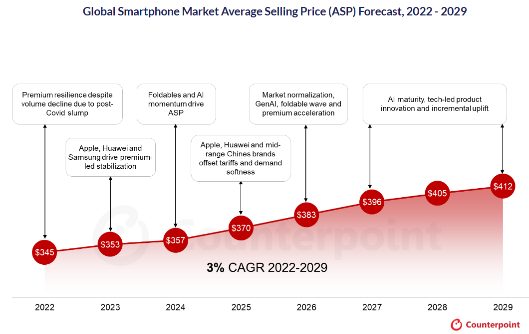 据市调机构Counterpoint Research的最新数据显示,在高端化的推动下,全球智能手机市场的平均售价(ASP)持续逐年增长,将从2024年的357美元增至2025年的370美元,到2029年将达到412美元,复合年增长率为3%。