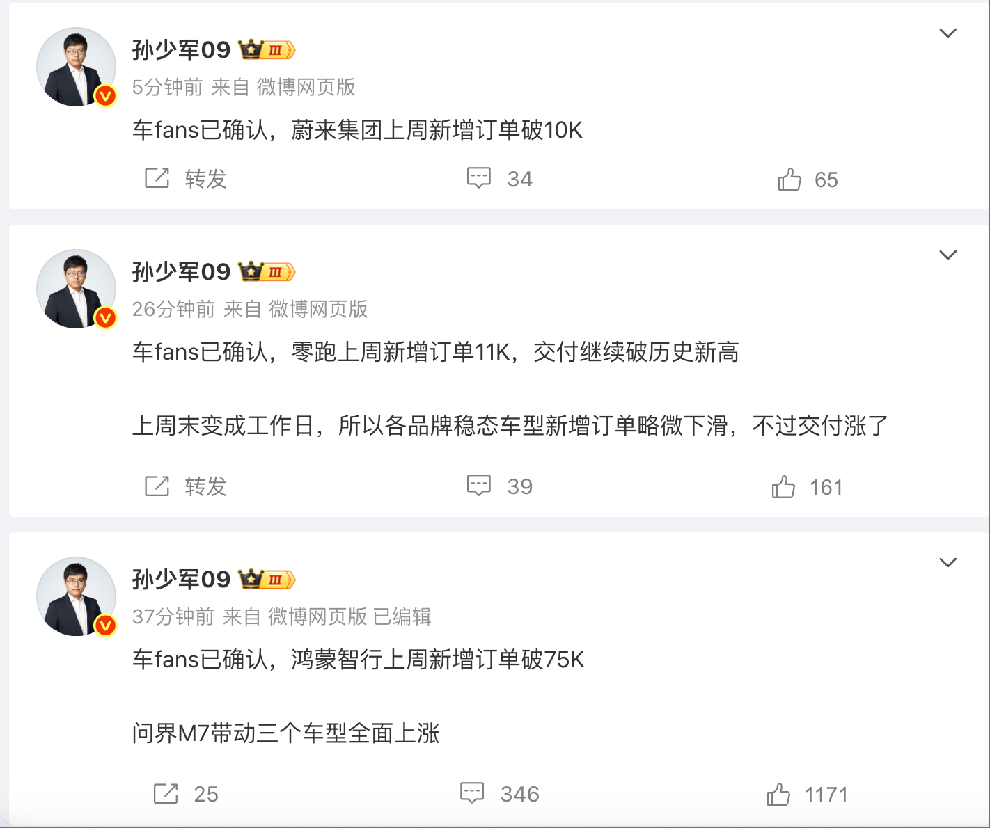 9月29日,汽车博主“孙少军09”分享了上周鸿蒙智行、零跑、蔚来汽车的订单数据。其中,鸿蒙智行上周新增订单破7.5万;零跑新增订单1.1万,交付继续破历史新高;蔚来集团新增订单破万。、