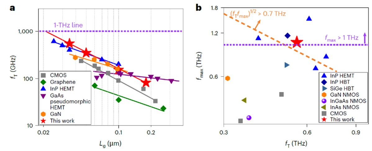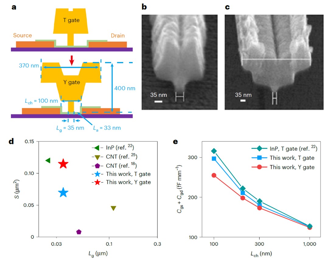 基于此,北京大学电子学院、碳基电子学研究中心、纳米器件物理与化学教育部重点实验室张志勇-彭练矛联合课题组基于阵列碳纳米管,通过缩减栅长至35nm并引入先进的Y型栅电极结构,降低栅电阻的同时保持低的寄生电容特性,成功制备出首个截止频率fmax超过1THz的金属氧化物半导体场效应晶体管,充分展现出碳纳米管在太赫兹高速领域的巨大应用价值。