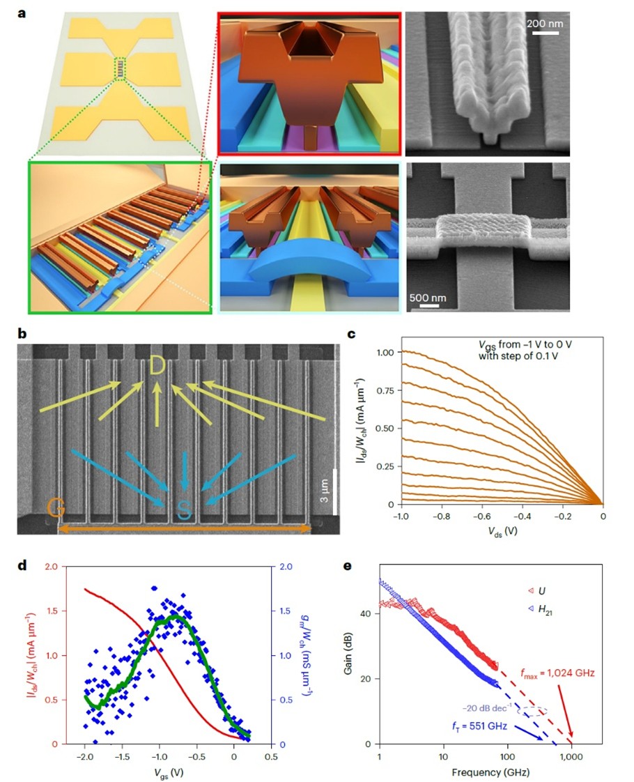 研究人员通过优化制备工艺和栅电极结构,在栅长Lg=80nm的器件上实现了3.02mA/um的开态电流和1.71mS/um的峰值跨导,载流子迁移率高达3190cm2V-1s-1,饱和速度达到3.5×107cm/s,接近碳纳米管速度极限;通过引入先进Y-gate栅电极并缩减栅长至35nm,在100um尺寸的射频器件上实现175mA和145mS的开态电流和跨导,实现截止频率ft/fmax高达551GHz/1024GHz,成功验证了碳纳米管的THz工作潜力。