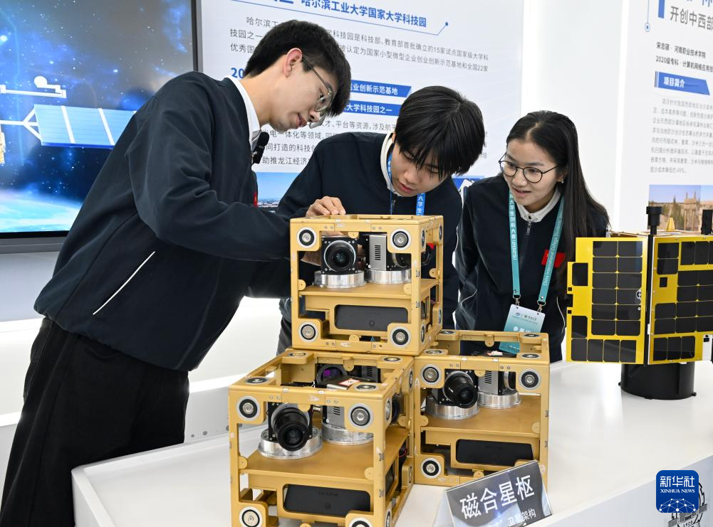 10月14日,在大学生创新成果展现场,哈尔滨工业大学代表在展示“磁合星枢——面向巨星座建设的新体制‘细胞’卫星平台”项目模型