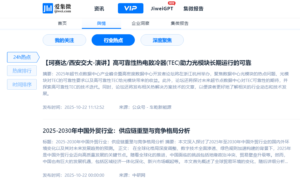 爱集微VIP舆情板块配备7×24小时全时监测网络,持续追踪超过10000个行业公众号与1000余家各类媒体,实现对行业动态、企业新闻、政策变迁与竞争情报的全天候、多维度覆盖。