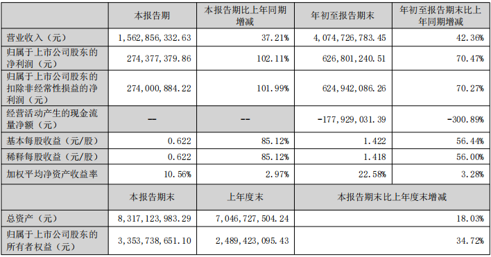 年初至报告期末,公司整体业绩更是可圈可点。累计营业收入40.75亿元,同比增长42.36%;归属于上市公司股东的净利润6.27亿元,同比增长70.47%;归属于上市公司股东的扣除非经常性损益的净利润6.25亿元,同比增长70.27%;基本每股收益1.422元/股,同比增长56.44%,加权平均净资产收益率22.58%,较上年同期提升3.28个百分点,盈利能力持续增强。