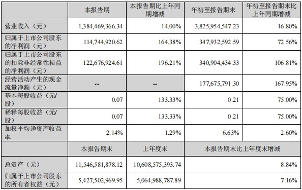 从年初至报告期末,公司累计业绩同样亮眼。累计营业收入38.26亿元,同比增长16.8%;归属于上市公司股东的净利润3.48亿元,同比增长72.56%;归属于上市公司股东的扣除非经常性损益的净利润3.41亿元,同比增长106.81%;基本每股收益与稀释每股收益均为0.21元/股,同比增长75%,加权平均净资产收益率6.63%,较上年同期提升2.60个百分点。