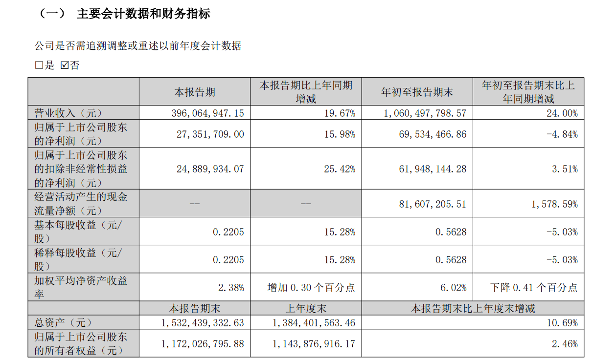 前三季度公司实现营业总收入10.6亿元,同比增长24%;归属于上市公司股东的净利润为6953.45万元,同比下降4.84%;扣除非经常性损益的净利润为6194.81万元,同比增长3.51%。