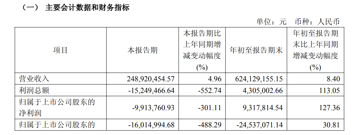 10月30日,发布2025年第三季度业绩报告。报告显示,第三季度公司实现营业收入2.49亿元,同比增长4.96%;归属于上市公司股东的净利润-991.38万元,同比下降301.11%;扣除非经常性损益的净利润-1601.5万元,同比下降488.29%。