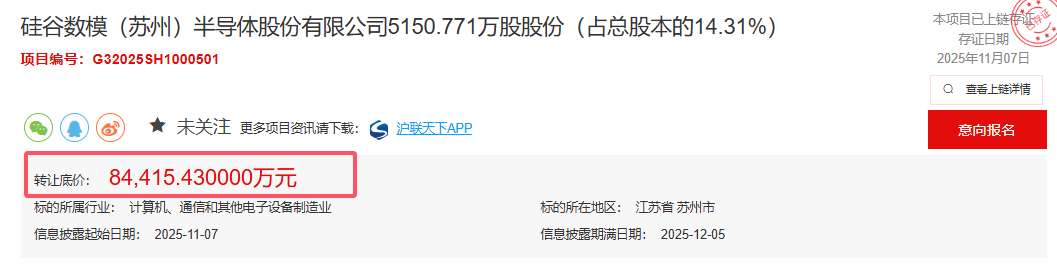 11月7日,上海产权交易中心披露,国家集成电路产业投资基金股份有限公司(简称“大基金”)挂牌转让硅谷数模(苏州)半导体股份有限公司(简称“硅数股份”)5150.771万股股份,转让数量占硅数股份总股本的14.31%,转让底价为84415.43万元。