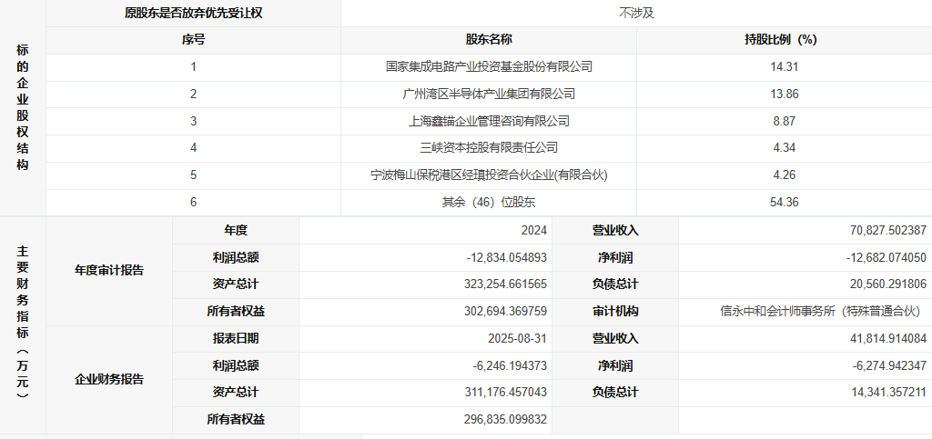 其前五大股东分别为大基金(持股比例为:14.31%)、广州湾区半导体产业集团有限公司(持股比例为:13.86%)、上海鑫锚企业管理咨询有限公司(持股比例为:8.87%)、三峡资本控股有限责任公司(持股比例为:4.34%)、宁波梅山保税港区经瑱投资合伙企业(有限合伙)(持股比例为:4.26%),其余46位股东合计持有54.36股权。