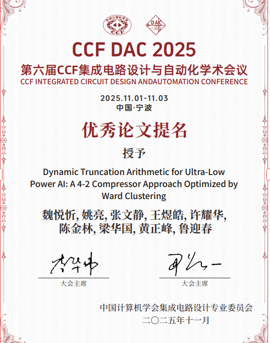 近日,由中国计算机学会主办的第六届CCF集成电路设计与自动化学术会议(CCF CAD 2025)于2025年11月1日至3日在宁波成功召开。会议期间,安徽大学2023级微电子科学与工程专业本科生魏悦忻所撰写的论文《Dynamic Truncation Arithmetic for Ultra-Low Power AI: A 4-2 Compressor Approach Optimized by Ward Clustering》荣获大会优秀论文提名奖,论文指导教师为姚亮。