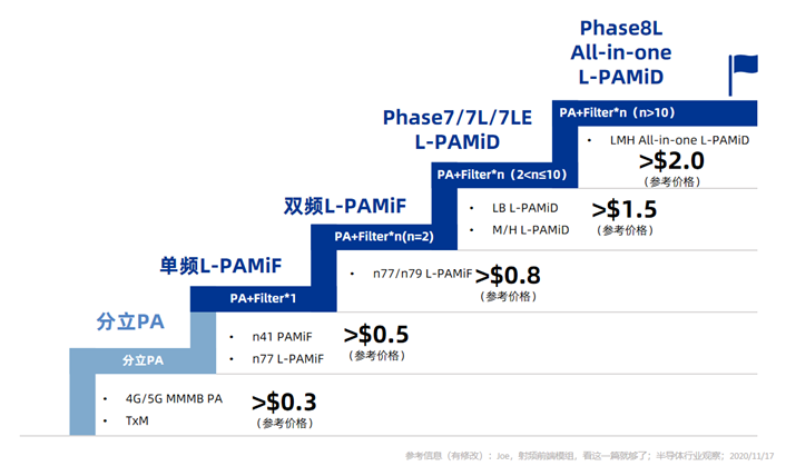 这一转变,瞬间将中国手机产业置于聚光灯下。高端/旗舰手机一般选择L-PAMiD及L-PAMiF高集成射频前端模组进行设计,并且向All-in-one全集成方案进行演进。技术难度逐步提高。