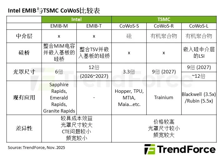 TrendForce指出,CoWoS方案通过中介层连接不同功能芯片,目前已发展出CoWoS-S、CoWoS-R与CoWoS-L等技术。随着NVIDIA Blackwell平台2025年进入规模量产,市场需求已高度倾向内嵌硅中介层的CoWoS-L。然而,CoWoS面临产能短缺、掩膜版尺寸限制和价格高昂等问题,促使Google、Meta等北美CSP积极与Intel接洽EMIB解决方案。