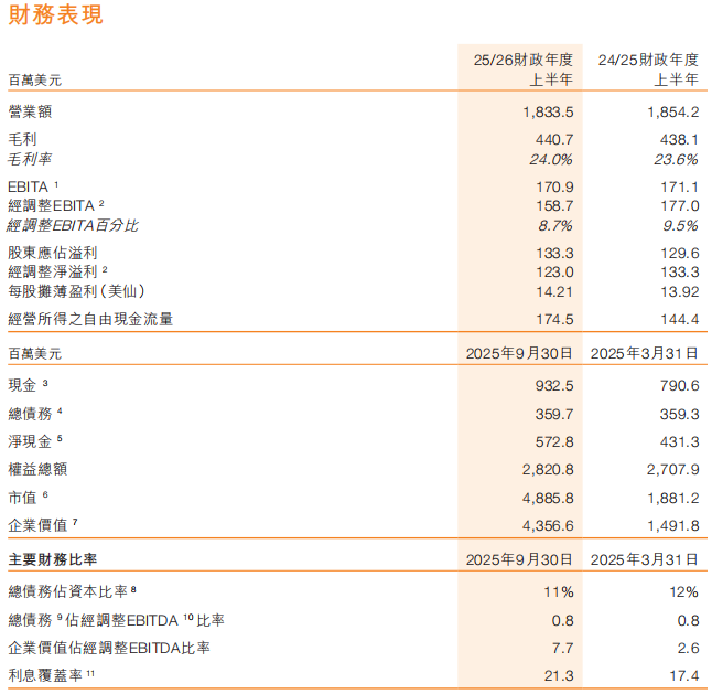 盈利方面,股东应占溢利净额同比增长3%至1.333亿美元,完全摊薄后每股盈利14.21美仙;经调整未计利息、税项及摊销前盈利(经调整EBITA)为1.587亿美元,占营业额的8.7%。经营所得自由现金流量表现亮眼,由上年同期的1.444亿美元增至1.745亿美元,主要受营运资金下降影响。