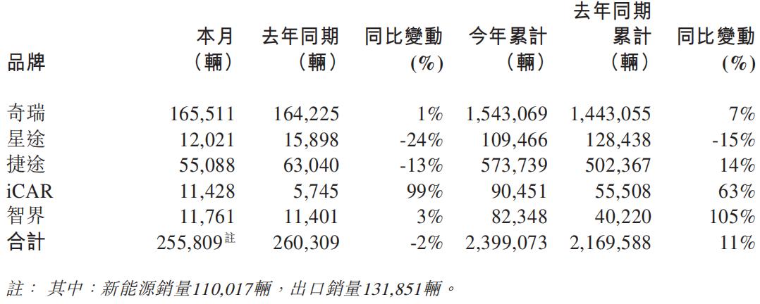 · 奇瑞品牌:11月销量165,511辆,较去年同期164,225辆同比增长1%;本年度累计销量1,543,069辆,较去年同期1,443,055辆同比增长7%,作为核心品牌持续发挥压舱石作用。
