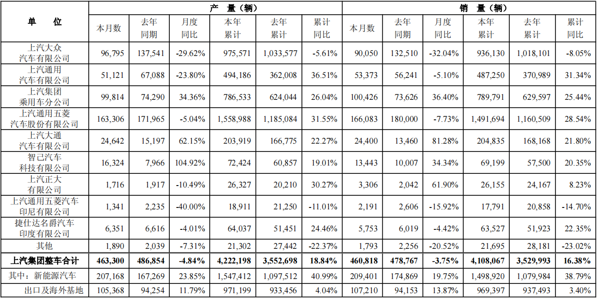 2025年11月,上汽集团整车合计产量463,300辆,较去年同期486,854辆同比下降4.84%;本年累计产量4,222,198辆,较去年同期3,552,698辆同比增长18.84%。