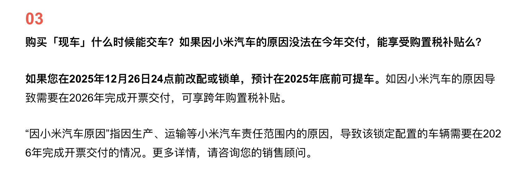 如果您在2025年12月26日24点前改配或锁单,预计在2025年底前可提车。如因小米汽车的原因导致需要在2026年完成开票交付,可享跨年购置税补贴。