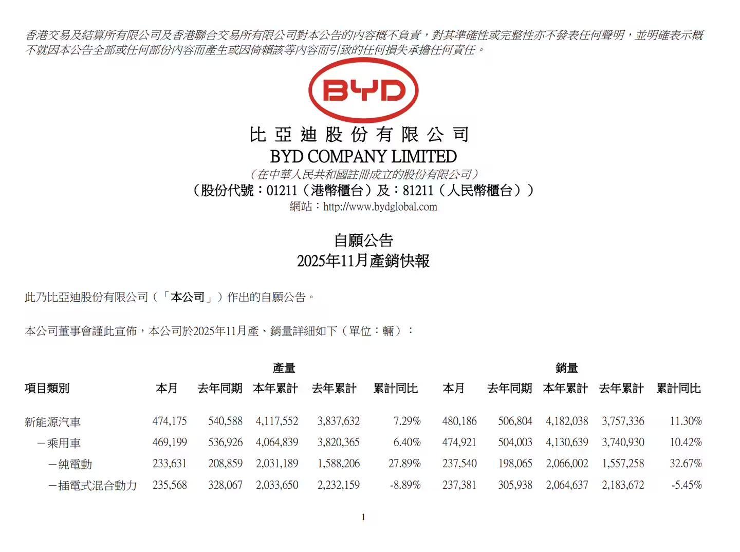 12月1日,比亚迪发布公告:11月汽车销量480186辆,去年同期506804辆。今年1-11月,汽车销量418万辆,同比增长11.3%。