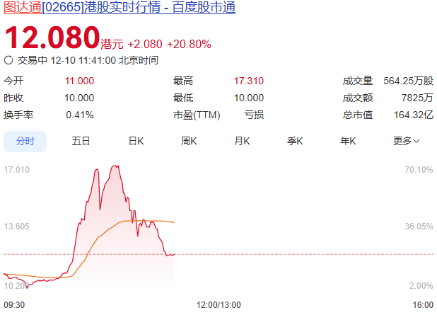 12月10日,图达通成功借壳TechStar Acquisition Corporation登陆港交所,股票代码为02665,股价一度冲高超17港元/股,截至发稿股价回落至12.08港元/股,较发行价提升20.8%总市值约164.32亿港元。