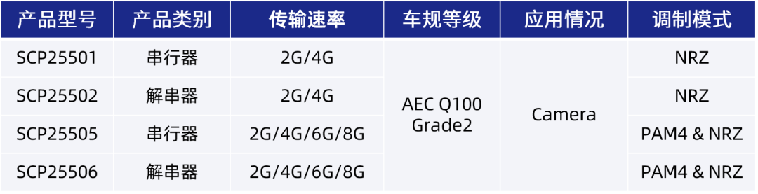 南芯科技本次推出两组专为高清摄像头视频传输设计的 SerDes 芯片,均通过 AEC Q100 Grade2 车规等级认证。SCP25501/2 支持 NRZ 调制模式,可实现 2G 和 4G 的传输速率。SCP25505/6 除了支持 NRZ 调制(可实现 2/4/6G 速率传输)外,还支持 PAM4 调制模式,同频率下可支持更高的带宽,可实现最高 8G 的传输速率。