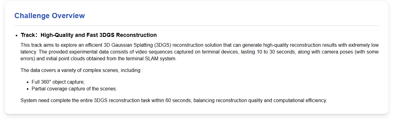 本次竞赛为参赛团队设置了极具挑战性的任务:参赛者需在60秒内,基于主办方提供的真实终端视频序列(10–30秒)、存在误差的相机轨迹以及终端 SLAM 点云,在极短时间内完成完整的3DGS 高质量重建。