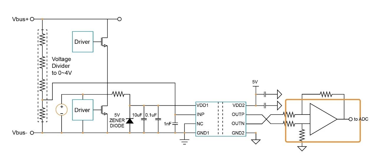 差分输出隔离电压采样应用电路图(橙框内为运放)