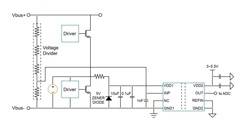 单端输出隔离电压采样应用电路图(无需后级运放)
