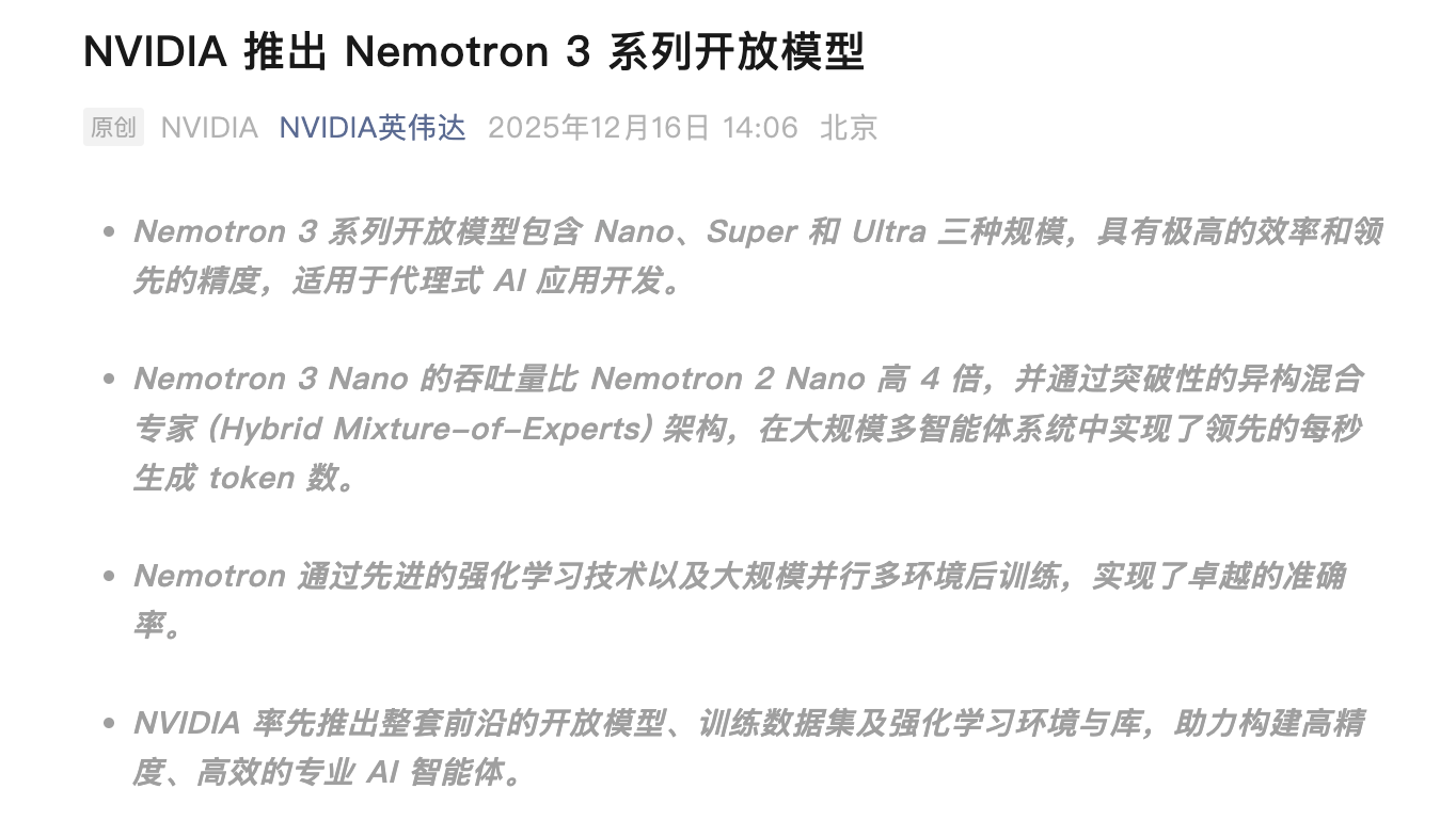 英伟达推出Nemotron 3系列开放模型 提供Nano、Super和Ultra三种规模