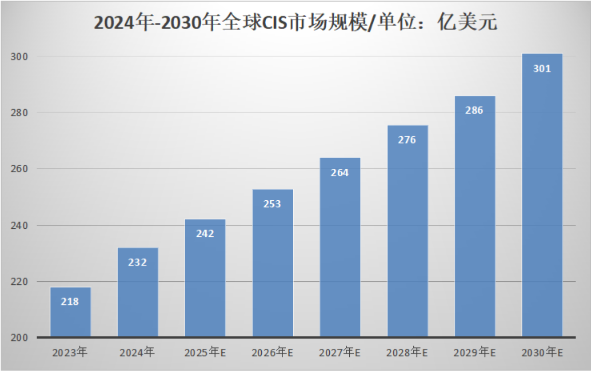 全球CIS市场正处于高速增长期,Yole数据显示,2024年市场规模为232亿美元,预计到2030年将增长至301亿美元,年复合增长率维持在4.4%左右。从近三年数据来看,2023年市场规模为218亿美元,2024年较2023年增长6.42%。
