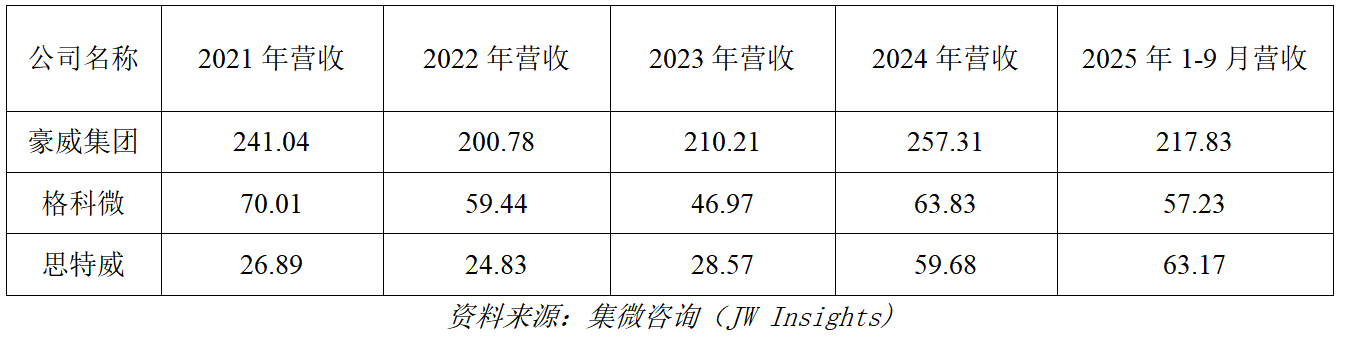 从近五年营收绝对值来看,三家公司呈现“阶梯式”格局,豪威集团始终处于第一梯队,格科微与思特威则在第二梯队内呈现“此消彼长”的态势。