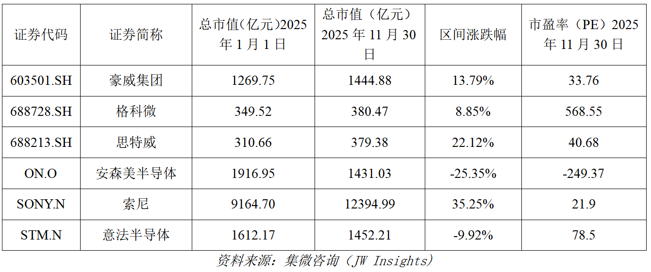 相比2025年初,涨幅前三的国内公司是思特威(22.12%)、豪威集团(13.79%)和格科微(8.85%)。国际巨头中,索尼实现大幅上涨(35.25%),而安森美半导体(-25.35%)和意法半导体(-9.92%)则出现下跌。从市盈率来看,截至2025年11月30日,格科微市盈率最高(568.55),其次是思特威(40.68)和豪威集团(33.76);国际巨头中,索尼市盈率为21.9,意法半导体为78.5,安森美半导体(-249.37)为负市盈率。