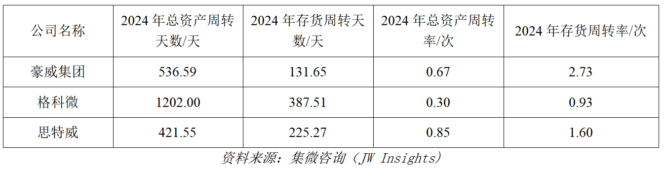 从总资产周转天数来看,三家公司差异显著:思特威表现最优,周转天数仅421.55天,是三家公司中唯一低于500天的企业;豪威集团总资产周转天数为536.59天,处于中间水平;格科微总资产周转天数最长,达1202天,仅为思特威的2.85倍。