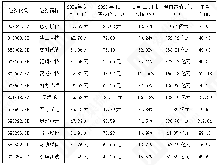 *2025年1-11月国内半导体传感器行业主要上市公司股价表现