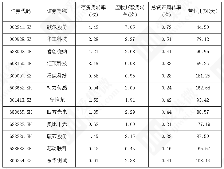 消费电子配套企业营运效率领先,歌尔股份存货周转率 4.42 次、应收账款周转率 7.05 次,总资产周转率 0.72 次,营业周期仅 44.50 天;军工及小众赛道企业表现较弱,芯动联科存货周转率 0.48 次、应收账款周转率 0.45 次,营业周期长达 466.67 天,受产品特性与客户付款周期影响显著。