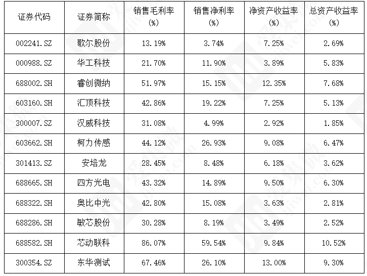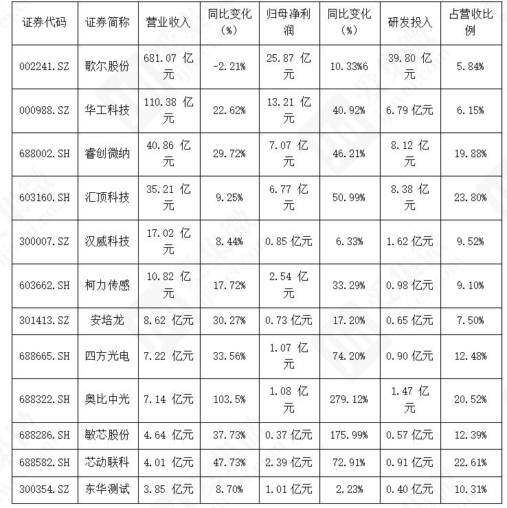 净利润规模呈梯度分布,歌尔股份以25.87亿元居首,华工科技、睿创微纳等构成第一梯队。增速上,细分领域企业表现突出,敏芯股份、奥比中光增速分别达 175.99%、279.12%,四方光电、芯动联科增速超 70%,而东华测试等小众赛道企业增速偏低,部分企业依赖补助支撑利润。