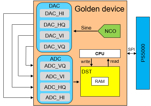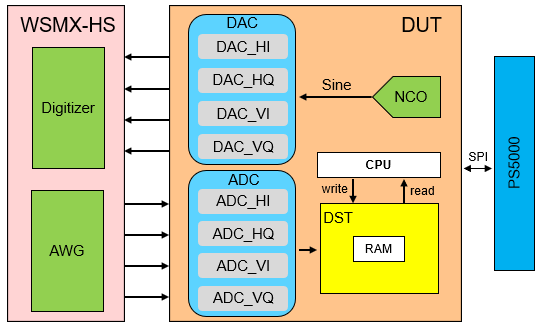 低频场景的测试方案如下图,使用WSMX-HS有以下优点:可以单独调试芯片的ADC或DAC,有利于分析调试时遇到的问题;该项目中ADC/DAC的通道较多,且需要同时测试,对模拟资源需求量大,WSMX-HS板卡的16个独立Unit和64个port可以支持多site并测;在低频段,WSMX-HS板卡参数优于芯片的设计指标,相比回环方案,可测出芯片更真实的数据。