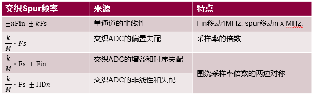 按照产生交织杂散的来源可分为四种,对应的交织杂散频率如下表。