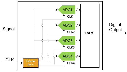 为满足高速信号采样的需求,高速ADDA芯片多采用时间交织(Time-Interleaved)结构,如下图是一种4个ADC通过时间交织技术组成的高速ADC。