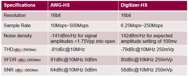 WSMX-HS板卡是一款高性能的混合信号测试板卡,它可以提供16组独立的模拟信号输入/输出资源;每组可提供一个AWG和一个Digitizer,可灵活连接两对差分端口;整张板卡共64个双向端口,支持差分或单端信号输入。其关键参数指标如下表: