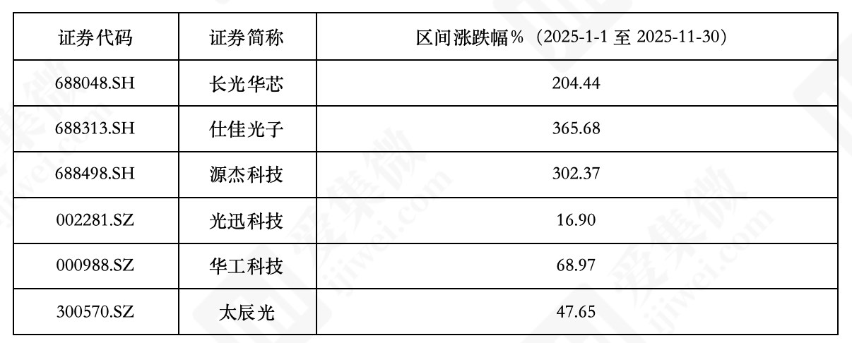 从区间涨跌幅看,六家企业呈现 “光芯片极致爆发、中游稳健分化” 的阶梯式格局,300% 以上的涨幅差距深刻反映光通信产业链 “上游技术突破 + 下游需求放量” 的传导效应,股价表现与赛道景气度、业务突破深度绑定。仕佳光子、源杰科技、长光华芯构成 “翻倍增长梯队”,涨幅均超 200%;华工科技、太辰光实现稳健增长;光迅科技则因体量与预期差因素涨幅相对温和,凸显市场对不同环节成长弹性的差异化定价。