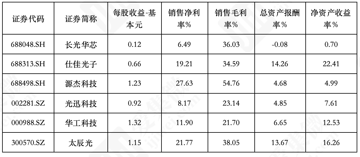 盈利表现与细分赛道盈利能力强相关,头部与特色企业优势显著。华工科技以 13.14 亿元净利润、1.32 元每股收益领跑,其光模块业务受益于 AI 数据中心需求放量,叠加激光设备在新能源领域的突破,盈利规模与质量双高;光迅科技(6.97 亿元)净利润规模次之,全球光模块市占率支撑稳健盈利,0.92 元每股收益体现成熟企业的盈利稳定性。细分领域中,仕佳光子(3.00 亿元)、太辰光(2.64 亿元)净利润超 2 亿元,其中仕佳光子凭借 PLC 器件高毛利特性,在 15.60 亿元营收基础上实现 3 亿元净利润,盈利效率突出;源杰科技虽营收仅 3.83 亿元,但 1.06 亿元净利润与 1.23 元每股收益表现亮眼,反映高端光芯片的高附加值优势;长光华芯(0.22 亿元)净利润规模最小,主要因高功率激光芯片研发投入大,尚未形成规模化盈利效应。