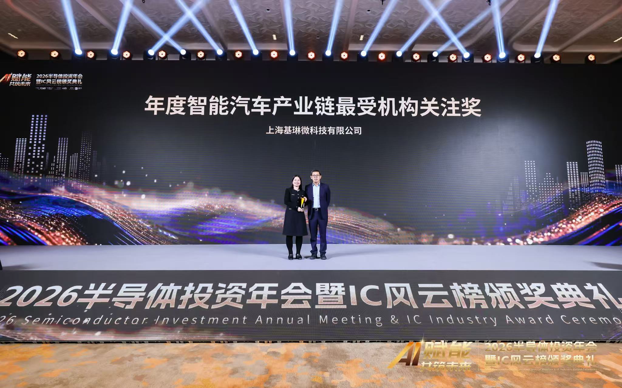 2025年12月20日,由半导体投资联盟和集成电路投资创新联盟主办、ICT知识产权发展联盟协办、爱集微承办的“2026半导体投资年会暨IC风云榜颁奖典礼”在上海隆重举行。凭借突出的技术创新实力与高度的资本认可度,上海基琳微科技有限公司(简称:基琳微)在众多企业中脱颖而出,成功摘得“年度智能汽车产业链最受机构关注奖”。