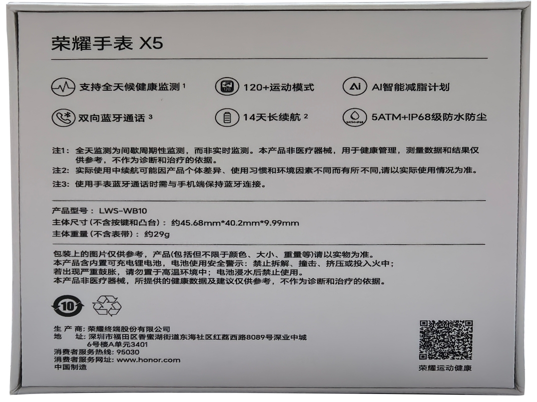 荣耀手表X5的卓越表现,离不开荣耀与扬贺扬两大品牌的实力支撑。 荣耀终端股份有限公司 作为知名智能设备制造商,荣耀秉持“以消费者为中心”理念,研发实力雄厚、质量管控严格。完善的售后服务体系为用户保驾护航:消费者服务热线95030,服务网址www.honor.com,随时提供咨询与支持。 江苏扬贺扬微电子科技有限公司 成立于2016年5月5日,是国内领先IC设计企业,通过ISO9001质量管理体系认证,总部位于无锡,在上海、深圳、南京、首尔等地设销售及研发中心,提供优质本地化服务。