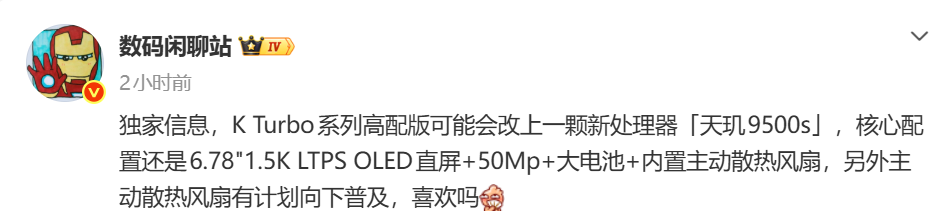 据数码博主“数码闲聊站”透露,OPPO旗下K Turbo系列新品的高配版本可能将搭载一款名为“天玑9500s”的新处理器。该博主表示,新机核心配置预计仍为6.78英寸1.5K LTPS OLED直屏、5000万像素主摄、大容量电池以及内置主动散热风扇。另有消息称,该主动散热技术计划向更多机型普及。