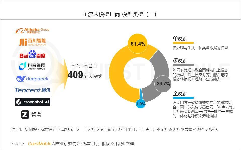 截止到2025年11月,8个主流厂商合计推出了409个大模型,其中,单模态、多模态和全模态占比分别为61.4%、36.7%、1.9%。这当中,多模态交互已经逐渐成为主流,“多模态输入”到“单模态输出”占比高达73.3%。