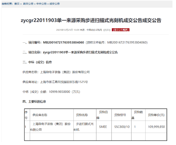 12月25日,据中国政府采购网公示,上海微电子装备(集团)股份有限公司(简称:上海微电子)中标zycgr22011903采购步进扫描式光刻机项目,设备数量为一台,成交金额1.1亿元。