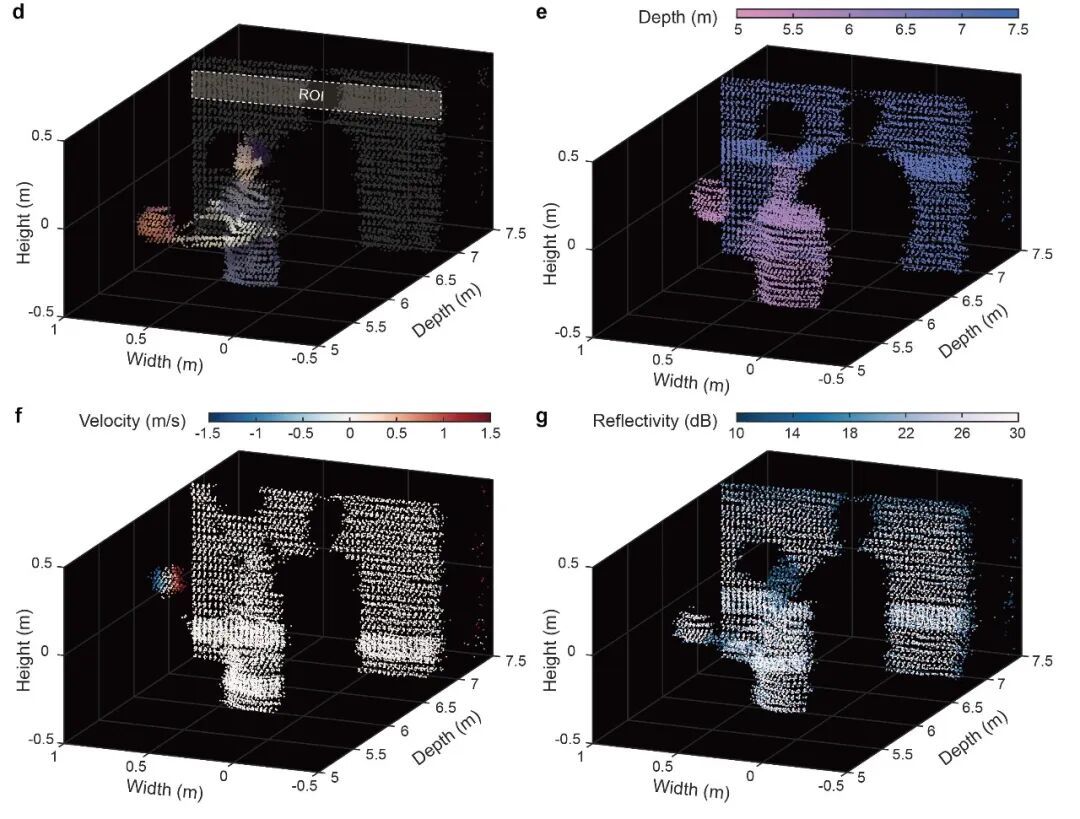 在此基础上,研究团队进一步演示了首个基于集成光梳的实时并行4D成像系统。在获取三维几何信息的同时,系统可同步解析目标速度与反射率信息,并与可见光相机开展多模态融合,实现点云上色,从而补足激光雷达难以直接获取的颜色外观信息,提升场景可解释性与语义表达能力,形成面向智能体任务的4D-plus场景表征。上述验证表明,该架构通过“凝视”资源分配提升有效采样效率,并将芯片级可重构并行通道作为核心能力支撑,为相干激光雷达走向可扩展、小型化、低功耗的集成化系统方案提供了系统级路径。