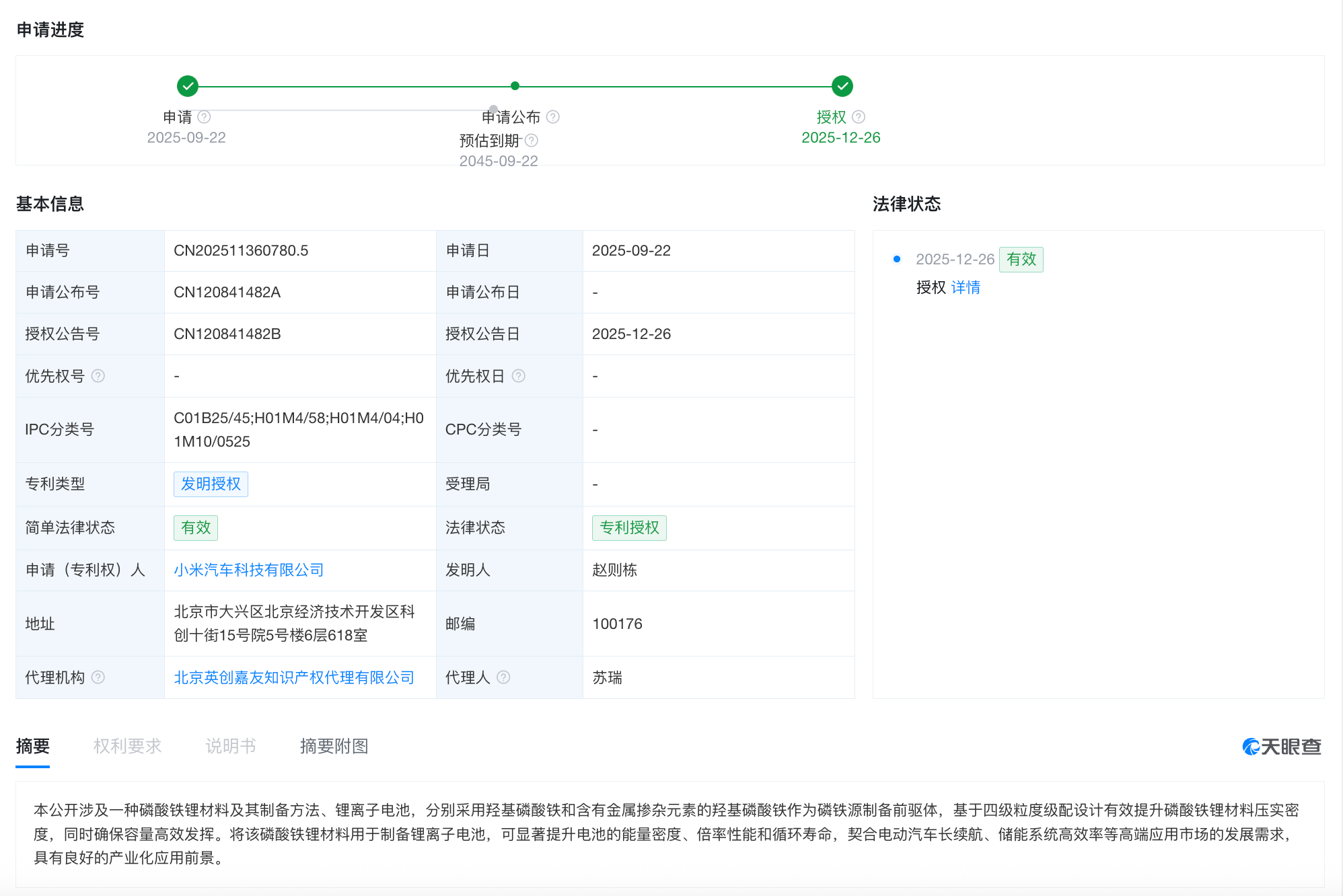 12月29日,天眼查显示,近日,小米汽车科技有限公司申请的“磷酸铁锂材料及其制备方法、锂离子电池”专利获授权。