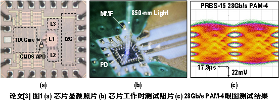 图1(a),(b),(c)分别展示了28 Gb/s PAM-4单片集成光接收机芯片显微图、测试照片和测试的眼图结果。